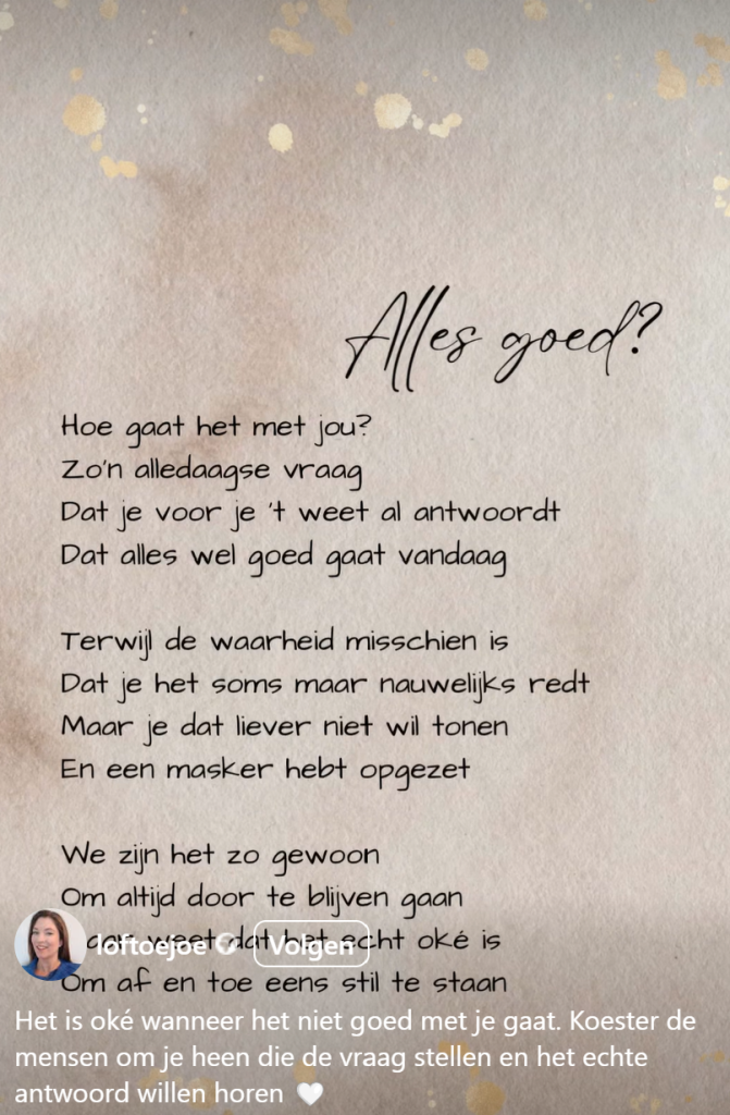 Ik snap de tekst in dit gedichtje volledig. Ik heb er jarenlang tegen gevochten. Het kon toch niet minder goed met mij gaan. Ik sloot me gewoon soms een paar dagen af van de wereld en trok me terug in mijn veilige cocon. Maar uiteindelijk was het daar ook eenzaam en helemaal niet zo leuk.